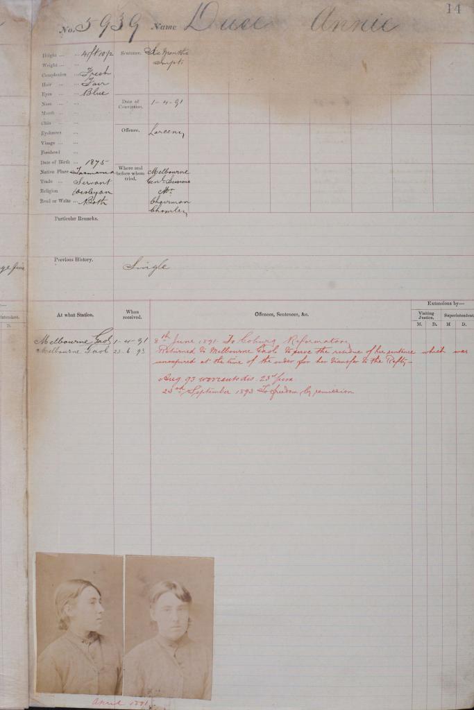 It sounds like Annie had an interesting life. She was one of the girls who was actually born in Tasmania. In 1874. I’m not quite sure when she came to Victoria but she was a state ward and she’d been sent to Coburg Reformatory for girls in 1891 because she had actually stolen some items, a silver watch, pendant and gold chain. She was working as a domestic for a family. I think the family, they were living in Essendon at the time, Annie did go to pawn shops to sell what she had stolen.