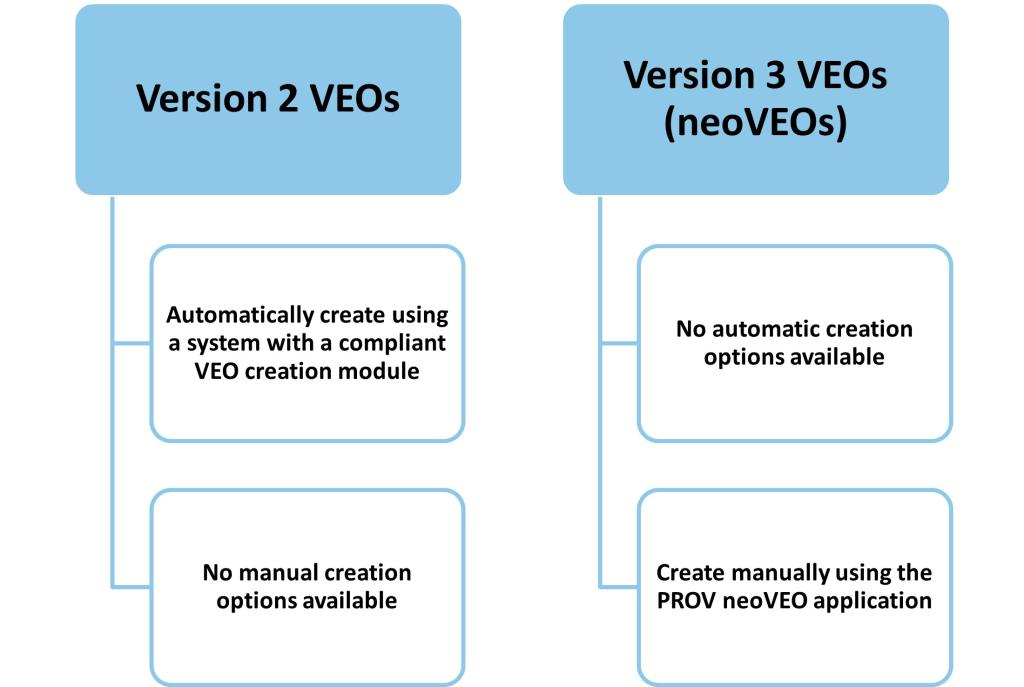 - Version 2 VEOs (created under the requirements of PROS 99/007 Management of Electronic Records Standard and its Specifications)
